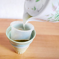 茶漉し網やフィルターの取り外しできるタイプの場合、一緒に使用するコップ1杯分(約150 ml)でお茶がしっかり浸る事を確認してください。大きすぎると1杯分の湯量ではお茶がお湯に十分に浸からない可能性があります。お茶の葉が泳げるお湯の空間が必要です
